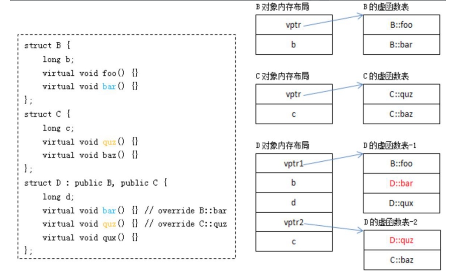 Derived *pd = new D(); B *pb = pd; C *pc = pd; 其中 pb, pd, pc 的指针位置是不同的,要注意的是派⽣类的⾃身的内容要追加在主基类的内存块后。