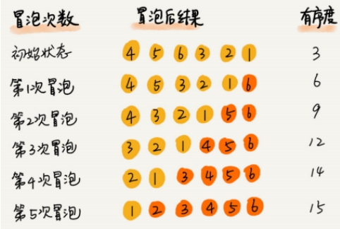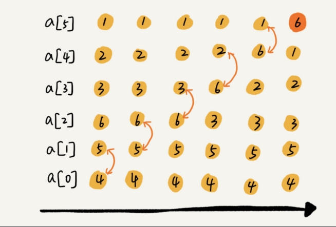 可以看出,经过⼀次冒泡操作之后,6 这个元素已经存储在正确的位置上。要想完成所有数据 的排序,我们只要进⾏ 6 次这样的冒泡操作就⾏了。