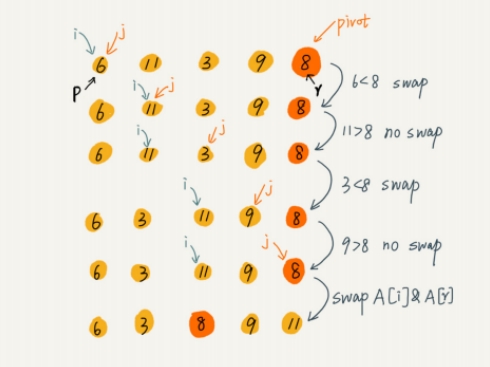 算法描述:先找到⼀个枢纽;在原来的元素⾥根据这个枢纽划分 ⽐这个枢纽⼩的元素排前 ⾯;⽐这个枢纽⼤的元素排后⾯;两部分数据依次递归排序下去直到最终有序。