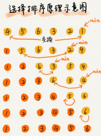 算法描述:分已排序区间和未排序区间。每次会从未排序区间中找到最⼩的元素,将其放到已排序区间的末尾。