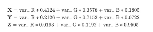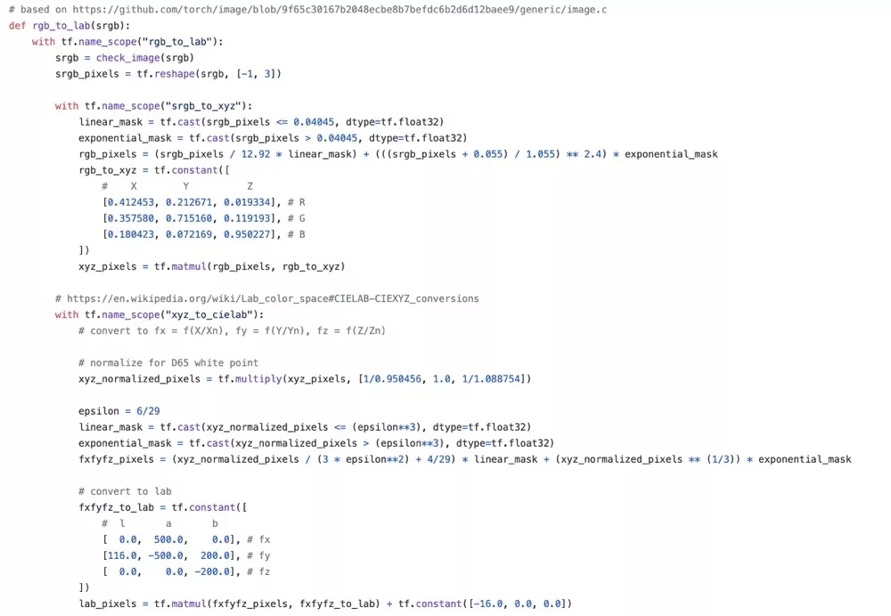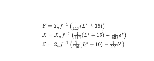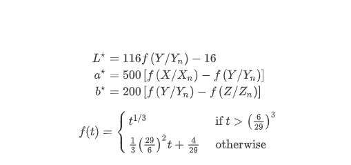 上面两个公式中$L^{\star}$, $a^{\star}$,$b^{\star}$是最终的LAB色彩空间三个通道的值。X,Y,Z是RGB转XYZ后计算出来的值,$X_{n}$,$Y_{n}$,$Z_{n}$一般默认是1,1,1。