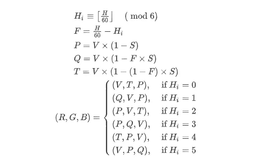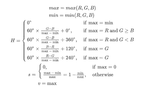 其中,Hue是用角度度量,取值范围为0~$360^{\circ}$,表示所处的光谱颜色的位置。Hue=0表示红色,Hue=120表示绿色,Hue=240表示蓝色,等等。