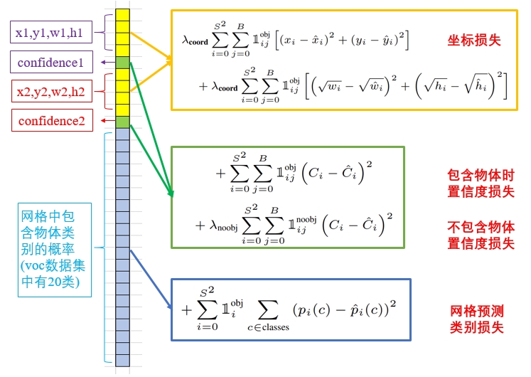 置信度也分成了两部分,一部分是包含物体时置信度的损失,一个是不包含物体时置信度的值。