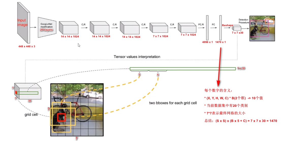 YOLO主要是建立一个CNN网络生成预测 $7 \times 7 \times 1024$ 的张量,