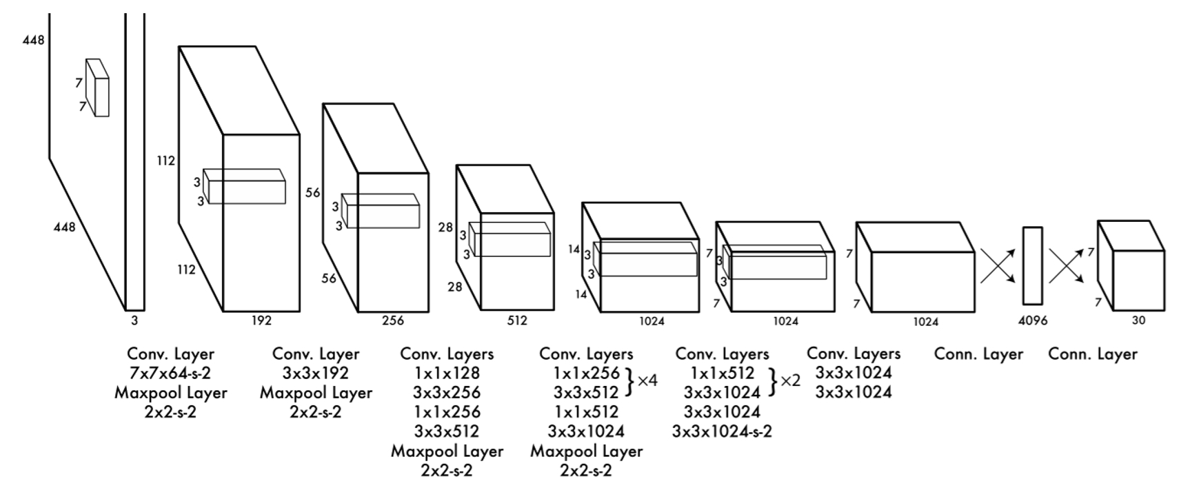 YOLO输入图像的尺寸为$448 \times 448$,经过24个卷积层,2个全连接的层(FC),最后在reshape操作,输出的特征图大小为$7 \times 7 \times 30$。