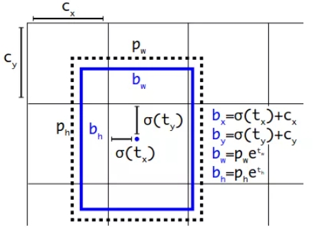其中,$(c_x,c_y)$为cell的左上角坐标。在上图中,当前的cell的左上角坐标为$(1,1)$。由于sigmoid函数的处理,边界框的中心位置会被约束在当前cell的内部,防止偏移过多,然后$p_w$和$p_h$是先验框的宽度与高度,它们的值也是相对于特征图(这里是$13 \times 13$,我们把特征图的长宽记作H,W)大小的,在特征图中的cell长宽均为1。这样我们就可以算出边界框相对于整个特征图的位置和大小了。如果想得到边界框在原图的位置和大小,那就乘以上网络下采样的倍数。