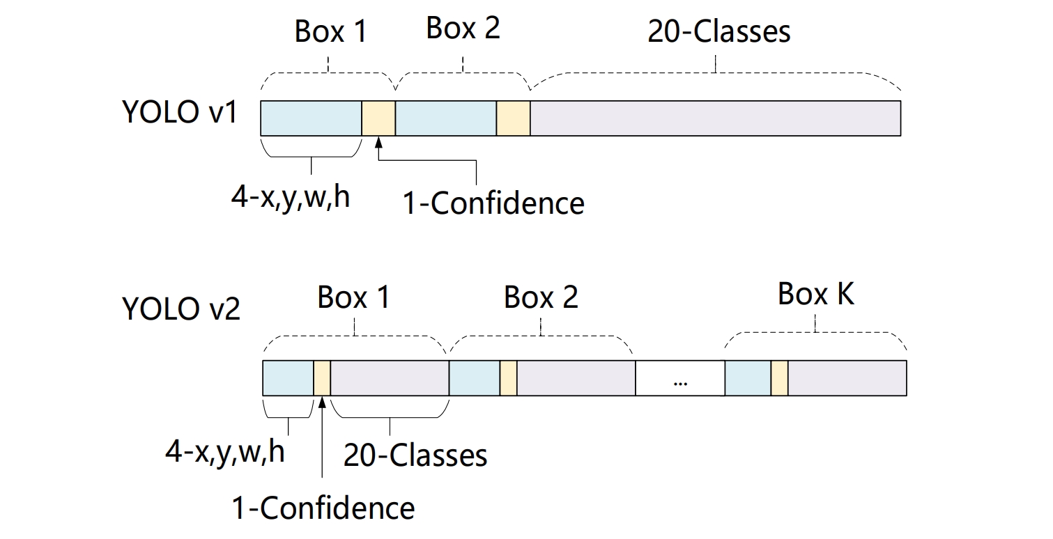 YOLOv1只能预测98个边界框(7 × 7 × 2),而YOLOv2使用anchor boxes之后可以预测上千个边界框 (13 × 13 × 5 = 845) 。所以使用anchor boxes之后,YOLOv2的召回率大大提升,由原来 的81%升至88%。