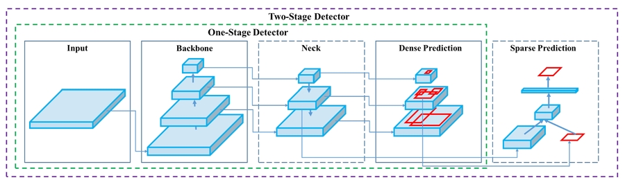 作者总结了近几年的单阶段和双阶段的目标检测算法以及技巧,并用一个图概括了单阶段和双阶段目标检测网络的差别,two-stage的检测网络,相当于在one-stage的密集检测上增加了一个稀疏的预测器