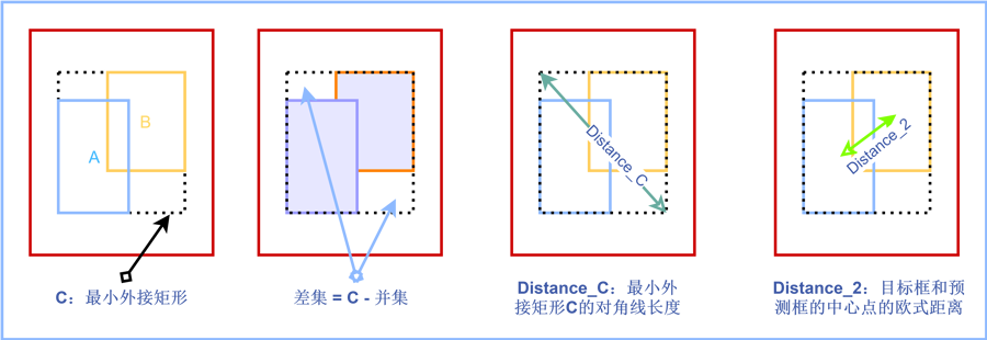 设:$C$为预测框和目标框的最小外接矩形,$Distance _ C$表示最小外接矩形的对角线距离,$Distance _ 2$表示预测框的中心点到目标框中心点的欧式距离