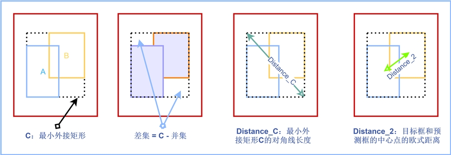 至此,CIOU Loss包含了一个好的预测框回归函数的三个重要的几何因素:重叠面积、中心点距离、长宽比。