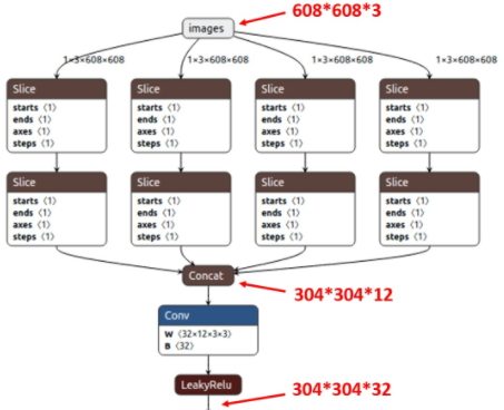 以Yolov5s的结构为例,原始$608 \times 608 \times 3$的图像输入Focus结构,采用切片操作,先变成$304 \times 304 \times 12$的特征图,再经过一次32个卷积核的卷积操作,最终变成$304 \times 304 \times 32$的特征图。