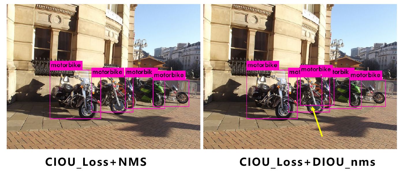 因为DIOU在计算loss的时候,需要考虑边界框中心点的位置信息,所以一些重叠物体也可以回归出来。因此在重叠目标的检测中,DIOU_nms的效果优于传统的nms。