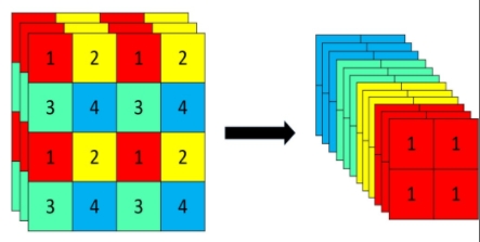 比如上图的切片示意图,$4 \times \times 4 \times 3$的图像切片后变成$2 \times 2 \times 12$的特征图。