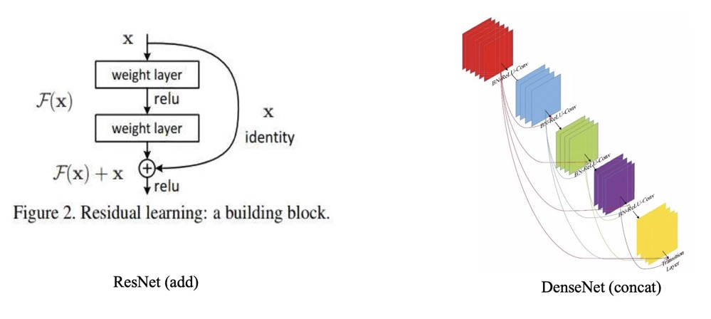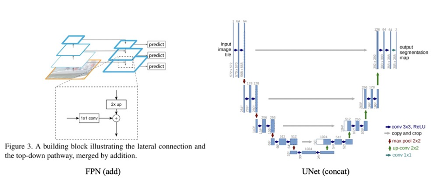 特征融合目前有两种常用的方式,一种是$add$操作,这种操作广泛运用于$ResNet$与$FPN$中。一种是$Concat$操作,这种操作最广泛的运用就是$UNet$,$DenseNet$等网络中。如下图所示: