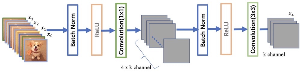 在DenseBlock中,各个层的特征图大小一致,可以在channel维度上连接。DenseBlock中的非线性组合函数$H(\cdot)$采用的是BN+ReLU+3x3 Conv的结构,所有DenseBlock中各个层卷积之后均输出 $k$ 个特征图,即得到的特征图的channel数为$k$,或者说采用 $k$ 个卷积核。 其中,$k$ 在DenseNet称为growth rate,这是一个超参数。一般情况下使用较小的$k$(比如12),就可以得到较佳的性能。假定输入层的特征图的channel数为 $k_{0}$ ,那么 $。