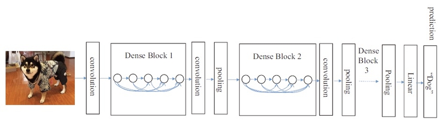 论文中给出的带有三个Dense Block 的DenseNet 结构图如下图所示,其中pooling层减少了特征的尺寸。同时,每个Block都需要维度上面对齐。