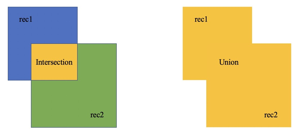 假设,我们有两个框,$rec1$与$rec2$,我们要计算其$IOU$。其中$IOU$的计算公式为,其交叉面积$Intersection$除以其并集$Union$。