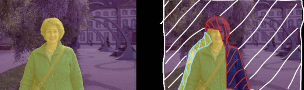 $prediction$图被分成四个部分,其中大块的白色斜线标记的是$true$ $negative$(TN,预测中真实的背景部分),红色线部分标记是$false$ $negative$($FN$,预测中被预测为背景,但实际上并不是背景的部分),蓝色的斜线是$false$ $positive$($FP$,预测中分割为某标签的部分,但是实际上并不是该标签所属的部分),中间荧光黄色块就是$true$ $positive$($TP$,预测的某标签部分,符合真值)。