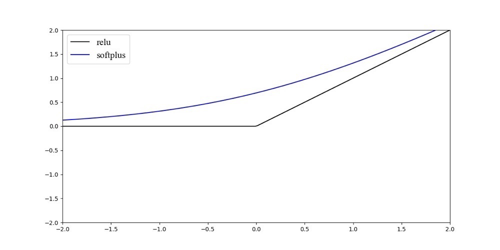 将$ReLU$与$Softplus$放在一起对比的话,则如图像所示: