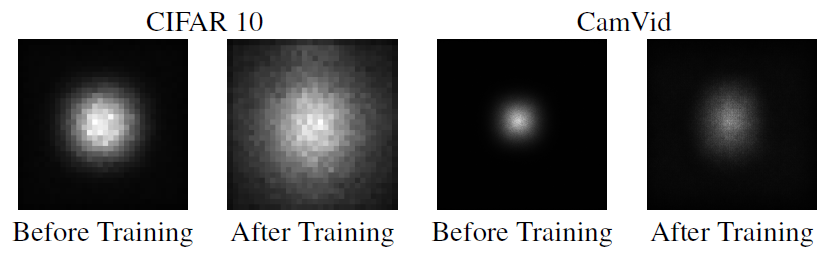 $Understanding$ $the$ $Effective$ $Receptive$ $Field$ $in$ $Deep$ $Convolutional$ $Neural$ $Networks$一文中提出了有效感受野($Effective$ $Receptive$ $Field$, $ERF$)理论,论文发现并不是感受野内所有像素对输出向量的贡献相同,在很多情况下感受野区域内像素的影响分布是高斯,有效感受野仅占理论感受野的一部分,且高斯分布从中心到边缘快速衰减,下图第二个是训练后$CNN$的典型有效感受野。