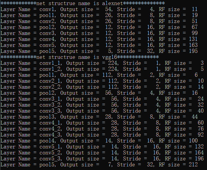 下面给出了由上述方法来计算$Alexnet$和$VGG16$网络中每一层输出特征图的感受野大小的$python$代码: