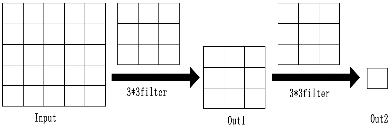 $Out2$中的值是由$Out1$中对应3 * 3的区域经过卷积计算得到的,即$Out2$中的感受野是$Out1$中整个3 * 3的区域;