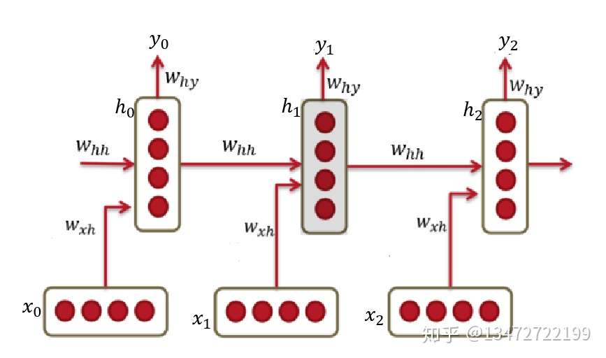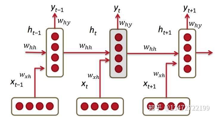 下图是RNN图示,简单说明是:有三个参数矩阵 ,三层网络结构(输入层,隐藏层,输出层),隐藏输出带入下次输入。