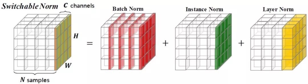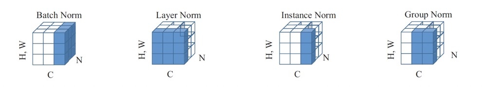 主要且常用的归一化操作有BN,LN,IN,GN,示意图如图所示。