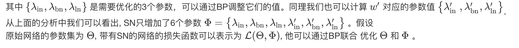 $SN$算法是为三组不同的 $\mu_{k}$ 以及$\sigma_{k}$ 分别学习三个总共6个标量值( $w_{k}$ 和$w_{k}^{\prime}$ ),$h_{n c i j}$表示一个输入维度为$n,c,i,j$的特征图,$\hat{h}_{n c i j}$为归一化之后的特征图。