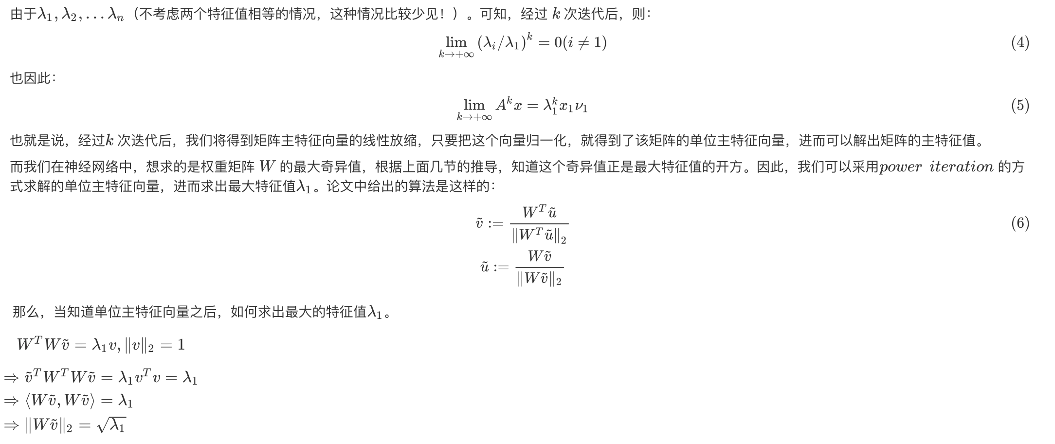 因此,可以把参数更新的 $step$ 和求矩阵最大奇异值的$ step$ 融合在一起,即每更新一次权重$ W$ ,更新一次和,并将矩阵归一化一次。