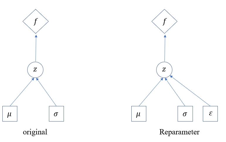左边的 $Original$ 方案,即我们从一个分布中,进行采样,来生成一个图片。而由于 $z \sim N(\mu, \sigma)$, 我们应该从 $N(\mu, \sigma)$ 采样, 但这个采样操作对 $\mu$ 和 $\sigma$ 是不可导的, 导致常规的通过误差反传的梯度下降法 (GD) 不能使用。