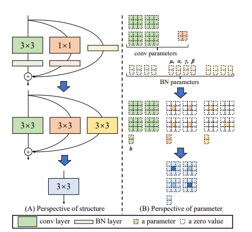 首先通过式3将残差块中的卷积层和BN层进行融合。途中第一个蓝色箭头上方,完成了几组卷积与$BN$的融合。包括执行$Conv$ $3$ * $3$+$BN$层的融合,图中的黑色矩形框中执行$Conv$ $1$ * $1$+$BN$层的融合,图中的黄色矩形框中执行$Conv$ $3$ * $3$(卷积核设置为全1)+$BN$层的融合 融合的公式为:$\mathrm{W}{i, \mathrm{i}, \mathrm{i}, \mathrm{i}}^{\prime}=\frac{\gamma{i}}{\sigma_{i}} \mathrm{~W}{i, \mathrm{r}, \mathrm{i}, \mathrm{i}}, \quad \mathbf{b}{i}^{\prime}=-\frac{\boldsymbol{\mu}{i} \gamma{i}}{\boldsymbol{\sigma}{i}}+\boldsymbol{\beta}{i}$。