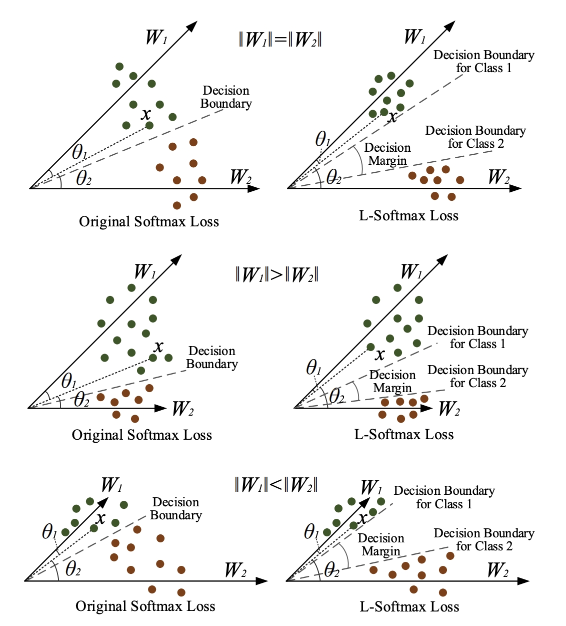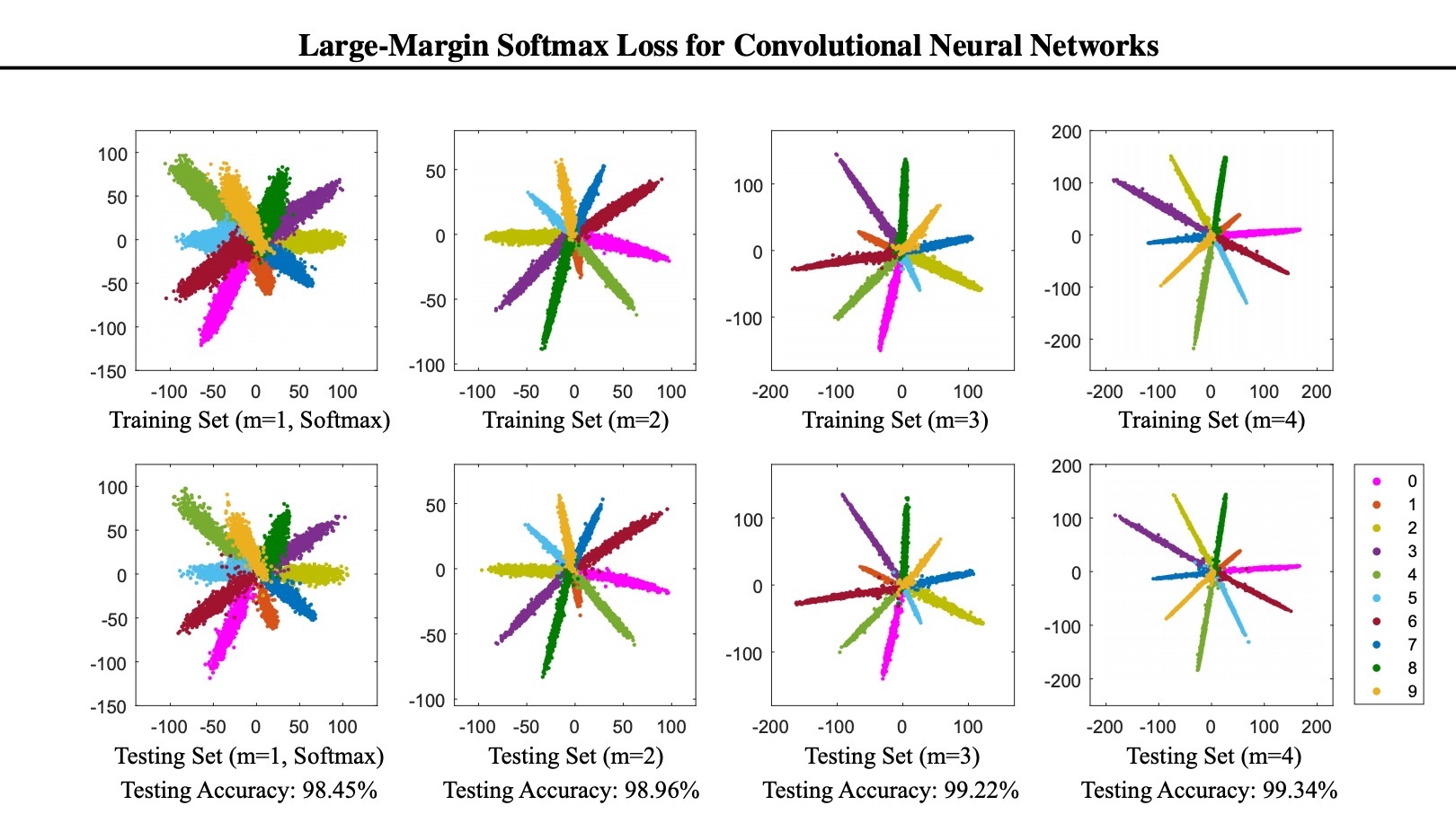 $L-Softmax$ $loss$中,$m$是一个控制距离的变量,它越大训练会变得越困难,因为类内不可能无限紧凑。