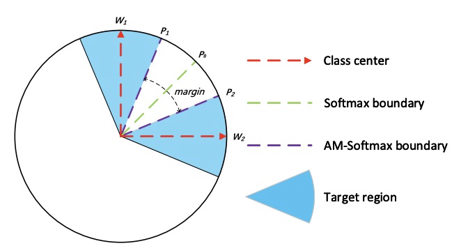 大佬也讨论了关于$AM-Softmax$的几何解释。相关的$m$控制着分类边界的大小,对于二分类任务,对于$1$类的分类边界,从$W^{T}{1}P{0}=W^{T}{2}P{0}$变成了$W^{T}{1}P{0}-m=W^{T}{2}P{0}$
