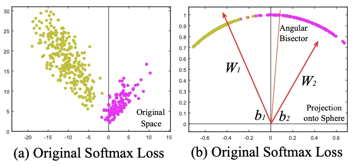如上图所示,可以看出决策边界由权值变量和角度的$cosine$值一起决定,这样子就导致了,在$cosine$维度进行度量的时候,两个类别之间会出现重叠($margin<0$)。