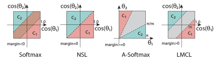 而$NSL$ $loss$是指权值和特征都进行正则化。在$cosine$维度进行度量的时候,两个类别之间有一个明确的决策边界。但是,由于边界空间为$0(margin=0)$,导致处于边缘的情况,很容易出现分类错误。