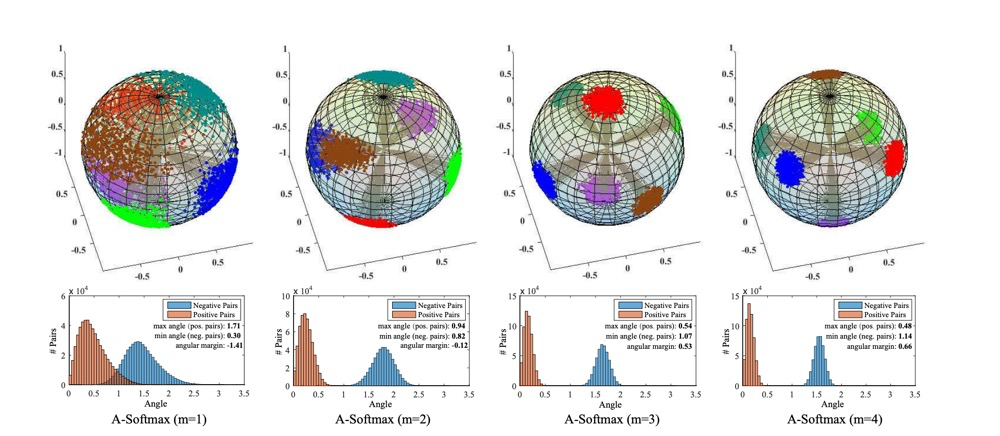 $A-Softmax$ 与$L-Softmax$均引入了一个参数因子$m$,将权重W和f的$cos$距离变为$cos(mθ)$,通过$m$ 来调节特征间的距离。