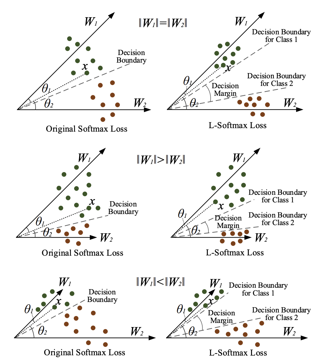 决策边界:$||W_{1}||cos(\theta_{1})=||W_{2}||cos(\theta_{2})$