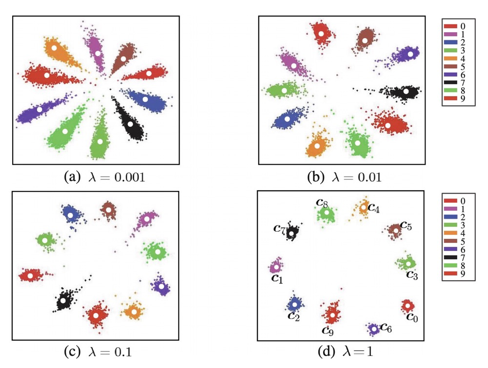 当我们在$Softmax$ $Loss$上额外添加$Center$ $Loss$,再来看下可视化的结果:
