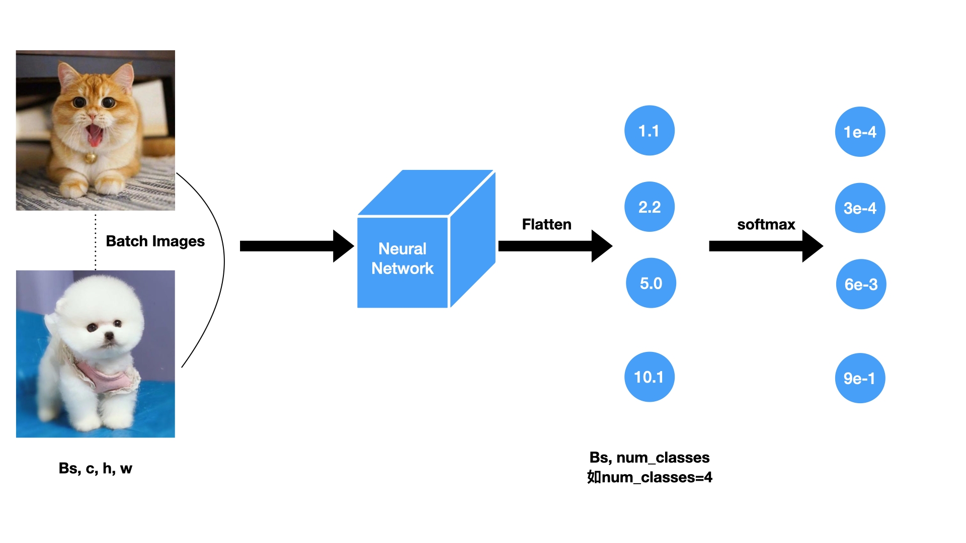 如上图,我们输入了一个$batch$的图片,经过神经网络之后,经过全连接层或者GAP层,得到了一个$(Bs, num_classes)$的向量。再通过$Softmax$层来进行归一化。$Softmax$的计算公式:$S_{i}=\frac{e^{i}}{\sum_{j}e^{j}}$。