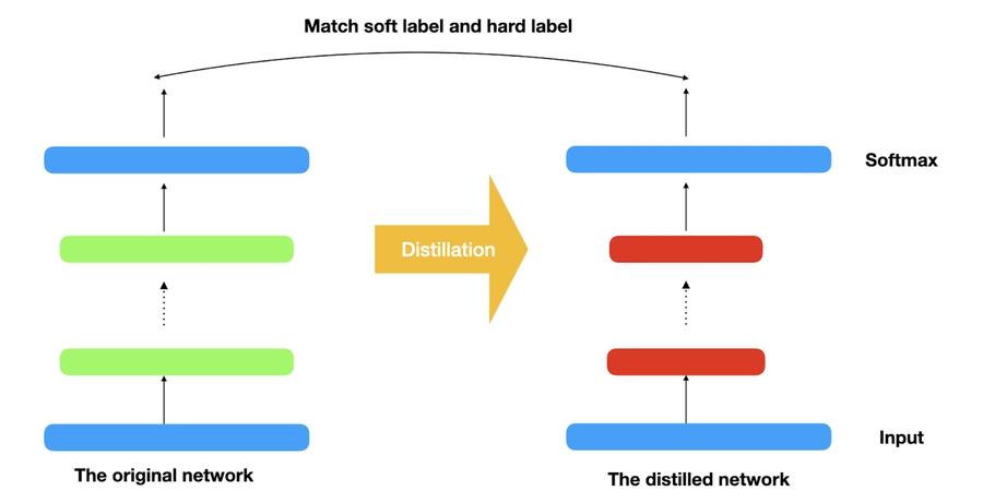 一个简单的知识蒸馏的形式是:用复杂模型得到的“软目标”为目标(在$softmax$中$T$较大),用“转化”训练集训练小模型。训练小模型时T不变仍然较大,训练完之后T改为$1$。