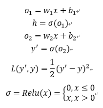 设有一个两层(一层隐含层,一层输出层)的深度学习回归模型,我们的激活函数设置为relu,我们的损失函数用均方误差,模型构造方程如下: