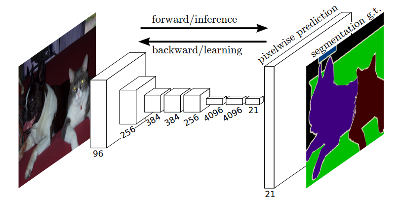 整体的网络结构分为两个部分:全卷积部分和反卷积部分。其中全卷积部分借用了一些经典的CNN网络(如AlexNet,VGG,GoogLeNet等),并把最后的全连接层换成卷积,用于提取特征,形成热点图;反卷积部分则是将小尺寸的热点图上采样得到原尺寸的语义分割图像。