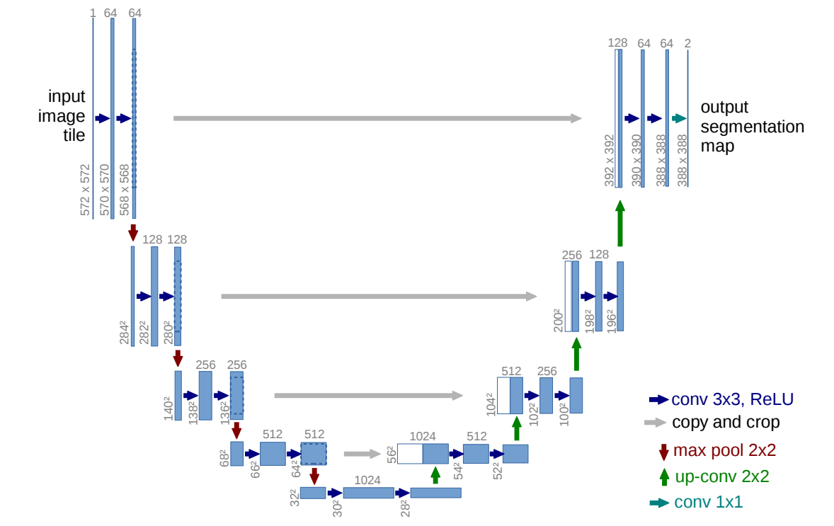 U-Net网络结构如上图所示。它由一个收缩路径(左侧)和一个扩展路径(右侧)组成。收缩路径遵循卷积网络的典型架构。它由两个3x3卷积(未填充卷积)的重复应用组成,每个卷积后跟一个整流线性单位(ReLU)和一个2x2最大池化操作,步长为2用于下采样。在每个降采样步骤中,我们将特征通道的数量增加一倍。