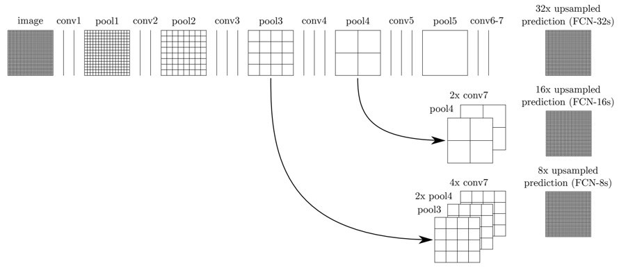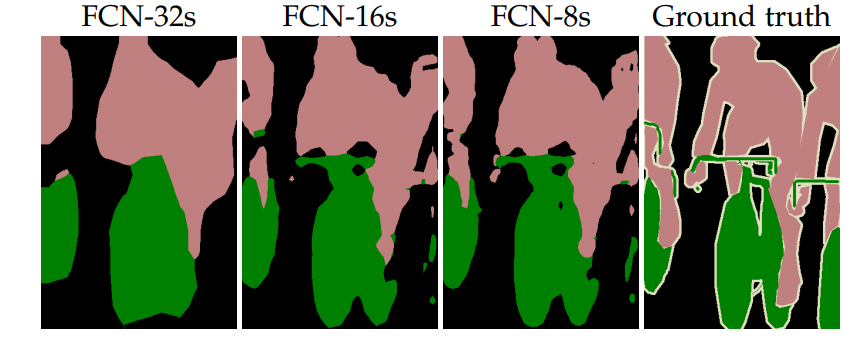 为了得到更好的分割效果,论文提出几种方式FCN-32s、FCN-16s、FCN-8s,如下图所示: