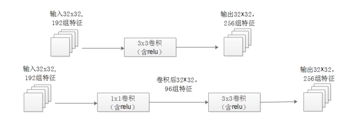 当某个卷积层输入的特征数较多,对这个输入进行卷积运算将产生巨大的计算量;如果对输入先进行降维,减少特征数后再做卷积计算量就会显著减少。图$3$是优化前后两种方案的乘法次数比较,同样是输入一组有$192$个特征、$32$x$32$大小,输出$256$组特征的数据,上面的卷积过程直接用$3$x$3$卷积实现,需要$192$x$256$x$3$x$3$x$32$x$32$=$452984832$次乘法;下面的卷积过程先用$1$x$1$的卷积降到$96$个特征,再用$3$x$3$卷积恢复出$256$组特征,需要$192$x$96$x$1$x$1$x$32$x$32$+$96$x$256$x$3$x$3$x$32$x$32$=$245366784$次乘法,使用$1$x$1$卷积降维的方法节省了将近一半的计算量。
