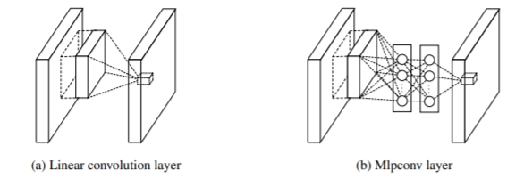 图$2$左图是是传统的卷积层结构(线性卷积),在一个尺度上只有一次卷积;右图是$Network$ $in$ $Network$结构($NIN$结构),先进行一次普通的卷积(比如$3$x$3$),紧跟再进行一次$1$x$1$的卷积,对于某个像素点来说$1$x$1$卷积等效于该像素点在所有特征上进行一次全连接的计算,所以右侧图的$1$x$1$卷积画成了全连接层的形式,需要注意的是$NIN$结构中无论是第一个$3$x$3$卷积还是新增的$1$x$1$卷积,后面都紧跟着激活函数(比如$relu$)。将两个卷积串联,就能组合出更多的非线性特征。举个例子,假设第$1$个$3$x$3$卷积+激活函数近似于$f1$($x$)=$ax2$+$bx$+$c$,第二个$1$x$1$卷积+激活函数近似于$f2$($x$)=$mx2$+$nx$+$q$,那$f1$($x$)和$f2$($f1$($x$))比哪个非线性更强,更能模拟非线性的特征?答案是显而易见的。$NIN$的结构和传统的神经网络中多层的结构有些类似,后者的多层是跨越了不同尺寸的感受野(通过层与层中间加$pool$层),从而在更高尺度上提取出特征;$NIN$结构是在同一个尺度上的多层(中间没有$pool$层),从而在相同的感受野范围能提取更强的非线性。