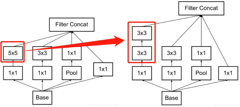 大尺寸的卷积核可以带来更大的感受野,但也意味着更多的参数,比如$5$x$5$卷积核参数是$3$x$3$卷积核的$2$5$/$9$=$2.78$倍。为此,作者提出可以用$2个连续的$3$×$3$卷积层组成的小网络来代替单个的$5$x$5$卷积层,在保持感受野范围的同时又减少了参数量,如图1所示: