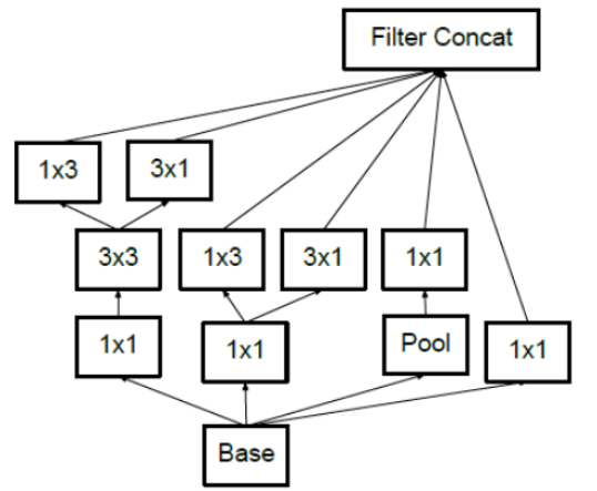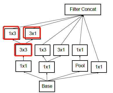 具体操作见图$5$所示,作者将$Inception$模块中的$3$×$3$卷积核分解成并行的$3$×$1$和$1$×$3$的卷积,用来平衡网络的宽度和深度。