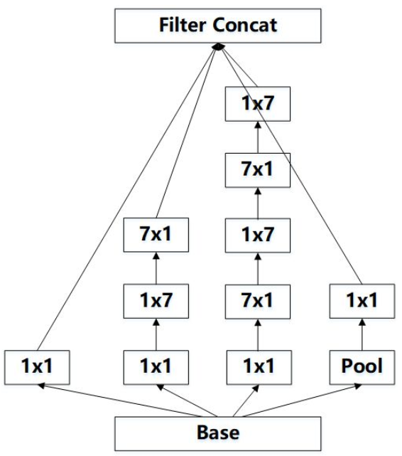 进一步的,作者将$n$x$n$的卷积核分解成$1$×$n$和$n$×$1$两个矩阵来进一步减少计算量,如下图$4$所示。实际上,作者发现在网络的前期使用这种分解效果并不好,只有在中度大小的$feature$ $map$上使用效果才会更好。(对于$m$×$m$大小的$feature$ $map$,建议$m$在12到20之间)。